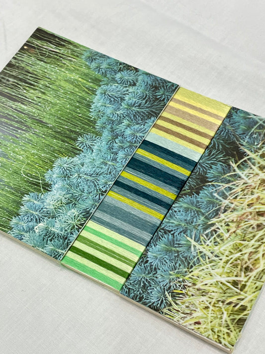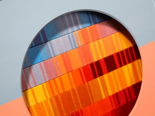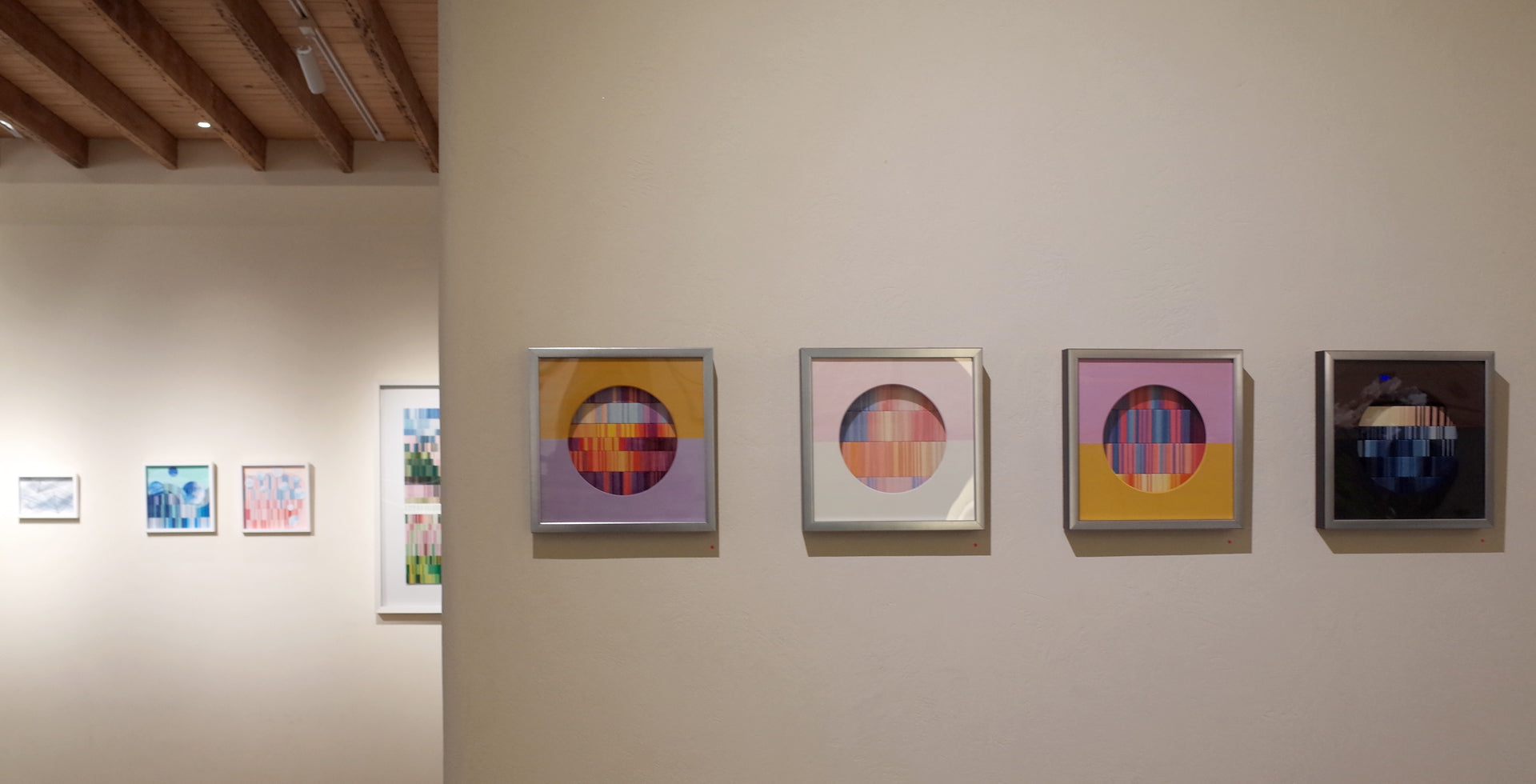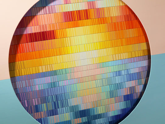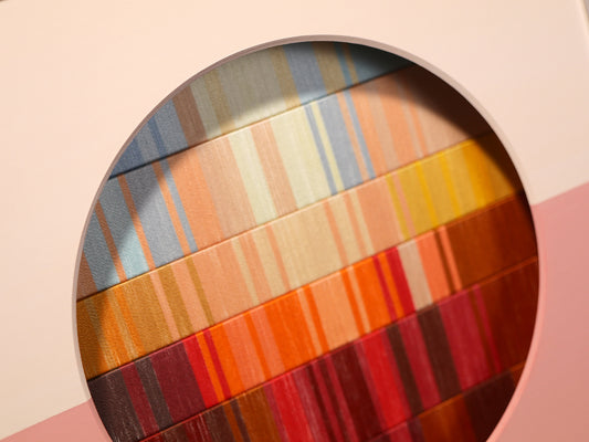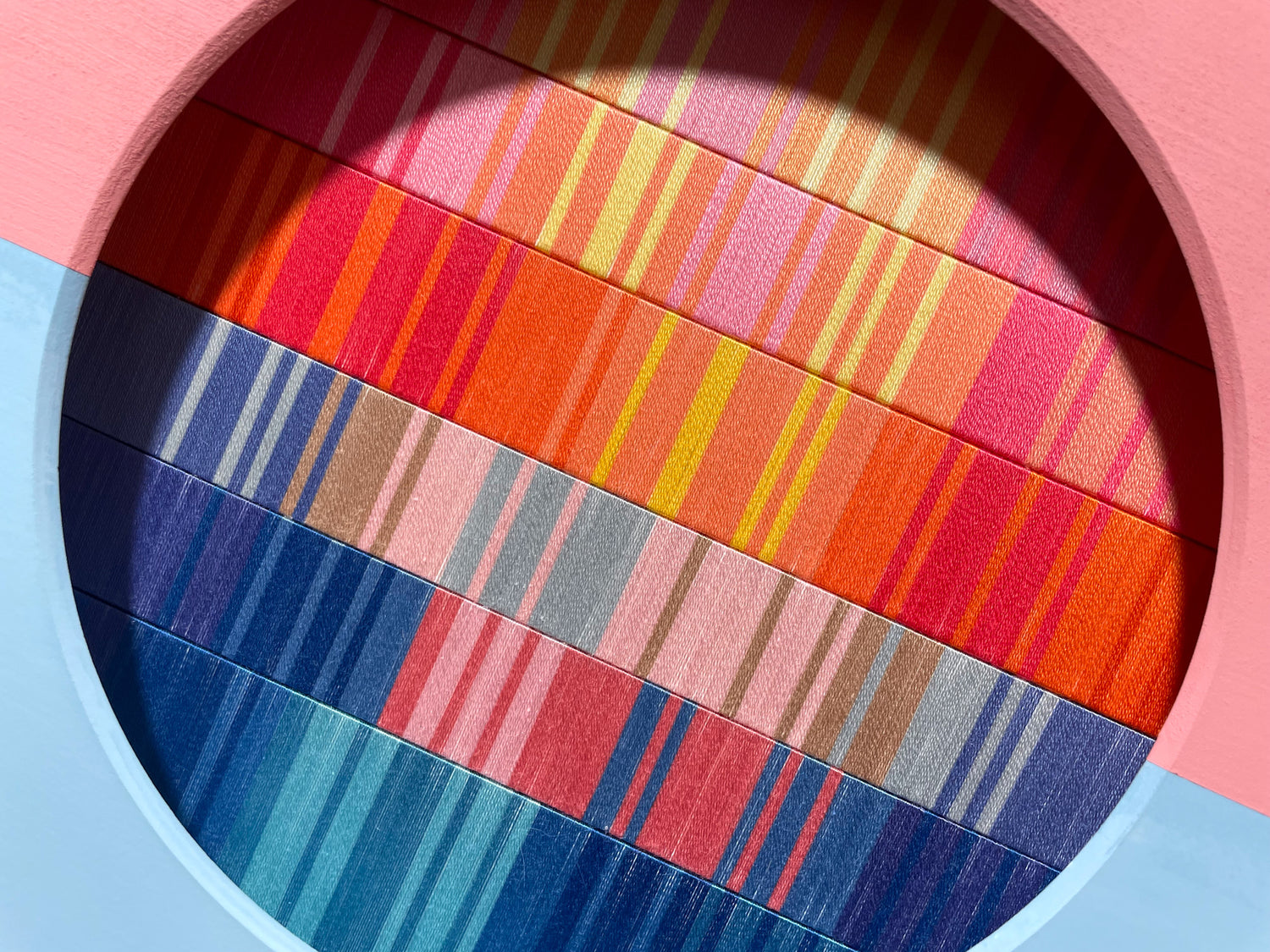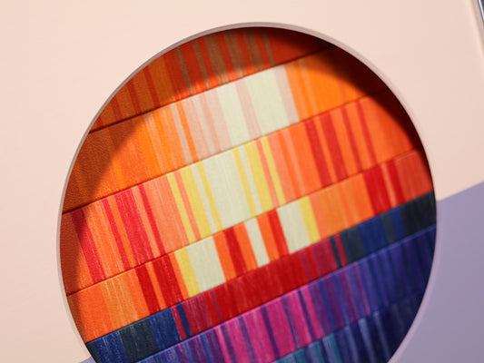 '아침 여명' 시리즈는 골판지에 면 자수 실을 감아 만든 작품입니다. 깊은 프레임 전면에 둥근 매트를 배치하여 아침 일출의 풍경과 색조를 닮은 작품을 완성했습니다.
