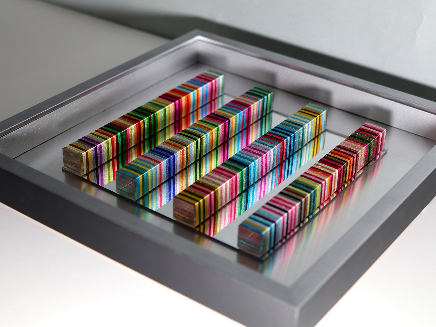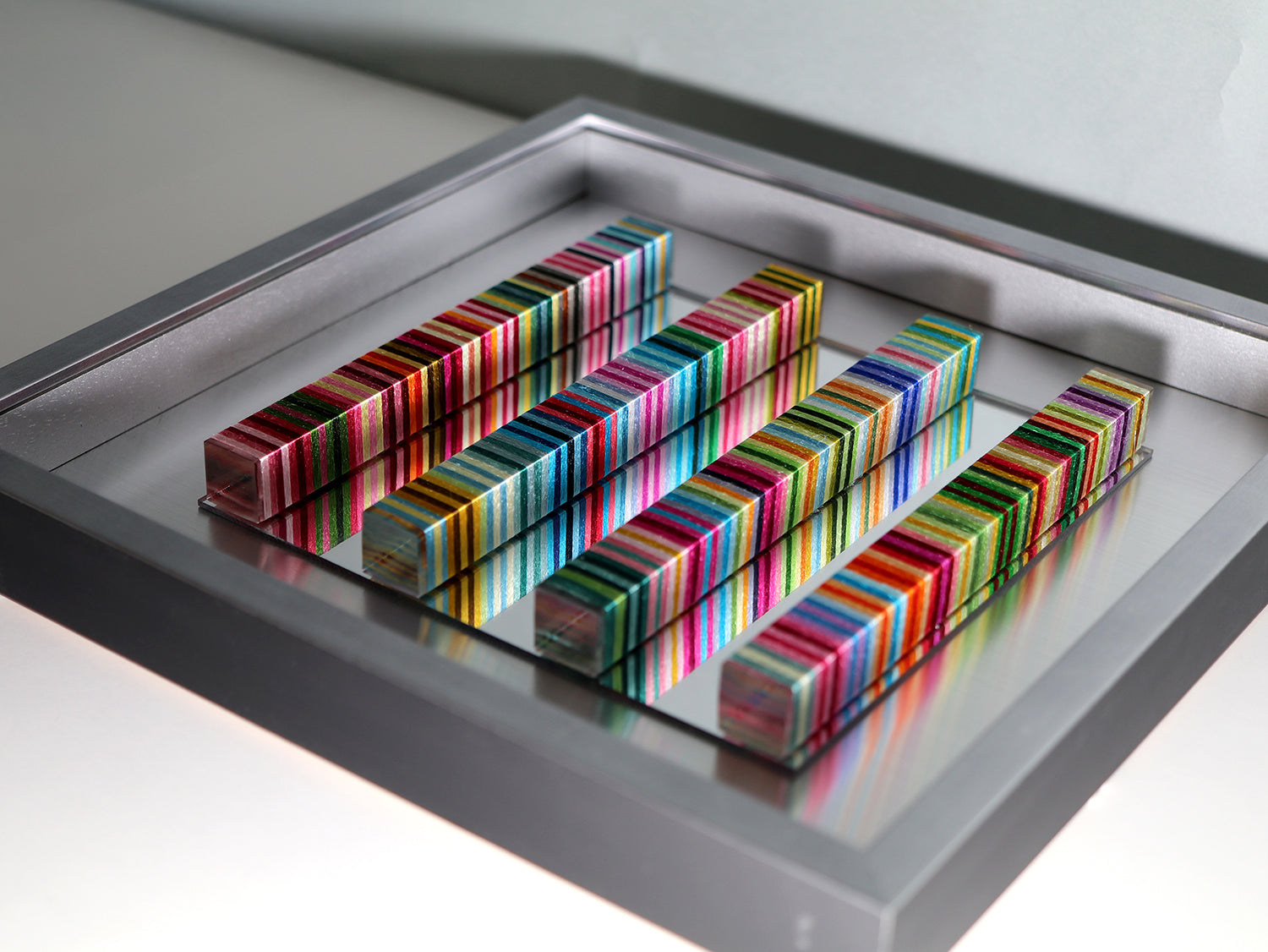 鏡を使用しているため、作品を置く空間や見る角度によって表情が変化する不思議な作品
